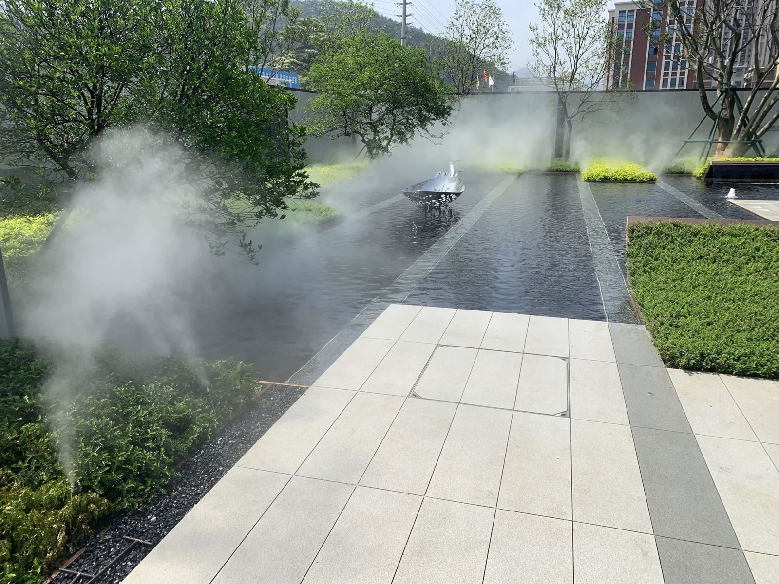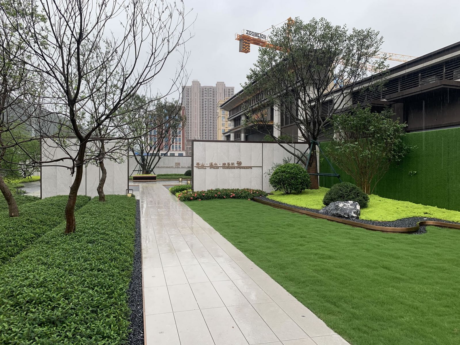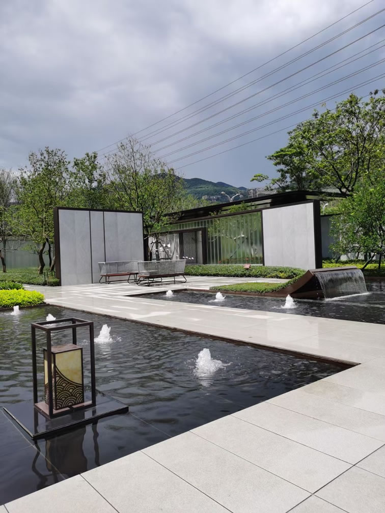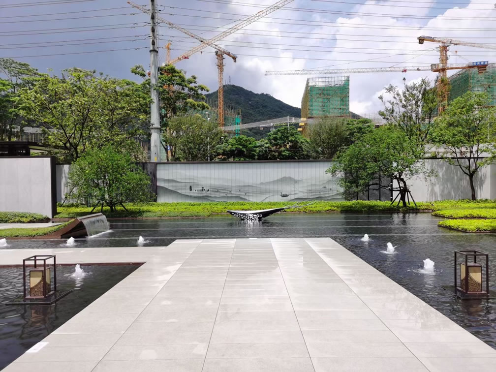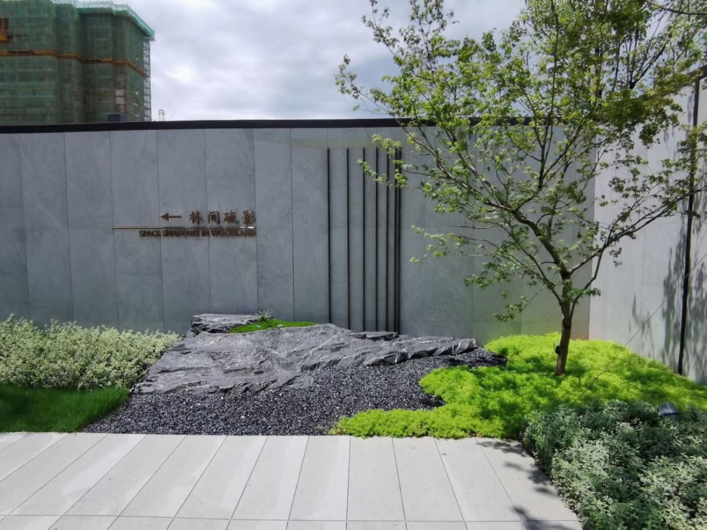 項目采用中式園林風格設計,使用芝麻灰、芝麻黑產品搭配鋪貼。