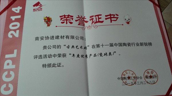 熱烈祝賀協(xié)進(jìn)陶瓷古典藝術(shù)磚在號(hào)稱“中國(guó)陶瓷行業(yè)奧斯卡”評(píng)選活動(dòng)中榮獲年度優(yōu)秀產(chǎn)品獎(jiǎng)。